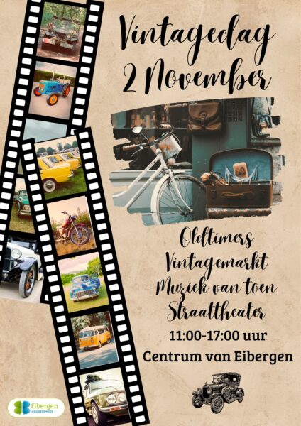 Naast de gewone najaarsmarkt is er in Eibergen dit jaar voor de 2e keer een Vintage dag. Vorig jaar was de eerste editie van de Vintagedag bij Halloweekend in Eibergen een groot succes dus dat gaan ze dit jaar weer doen. Vorig jaar deden 75 oldtimers bezitters mee aan de “static” in het centrum. Overal in het centrum aangesloten aan de markt, stonden vele verschillende voertuigen tentoongesteld. Er is muziek in de stijl van toen, en o.a. de Vrienden van de piepende wielen (antieke kinderwagens) en de battle tanks (miniatuur tankjes) zijn te bekijken die dag.